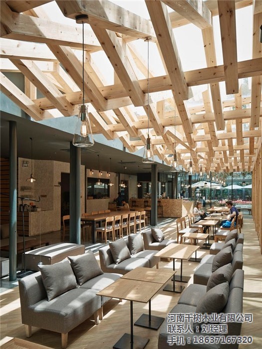 且新增的木梁在原有的鋼梁結(jié)構(gòu)之間交織穿梭,形成豐富有層次的光影效果,尤其是在天氣晴好的時(shí)候,體驗(yàn)感更為直接。對(duì)于空間區(qū)域的分割,設(shè)計(jì)團(tuán)隊(duì)也著手從天花板部分來創(chuàng)造。比如前述提到的主要的編織木梁結(jié)構(gòu),其下方的空間寬敞明亮,更適合于那些喜愛沐浴在陽光或自然天光之下的客人們。而靠近建筑內(nèi)部的空間,在灰黑色的天花板映襯之下,則要顯得沉穩(wěn)、私密一些,顯然更適合那些需要安靜空間的客人們。