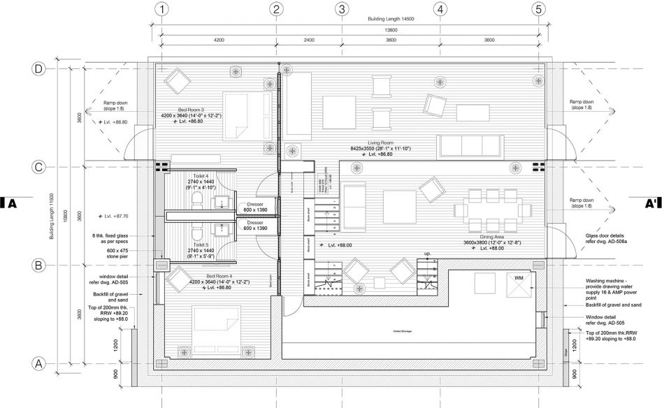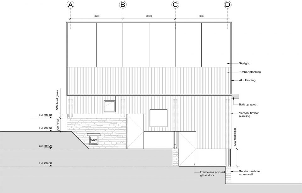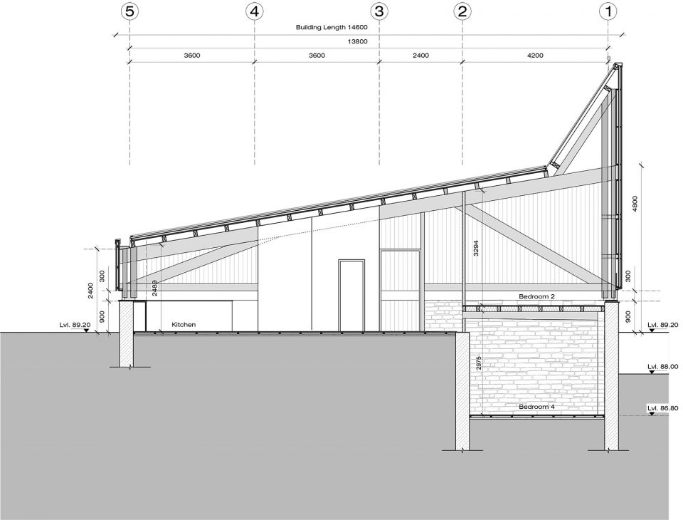 空間由三個(gè)不同的層次組成,每一個(gè)都大約占用14.5米x3.6 m的自然地形,外立面的連續(xù)橫窗使得周圍的果園和Almora鎮(zhèn)的壯觀景色一覽無(wú)余。這個(gè)開窗像是一個(gè)裂縫,成為現(xiàn)場(chǎng)挖出的裸露的干石墻基地和當(dāng)?shù)孛麨閠hun木材包覆之間的過(guò)渡。