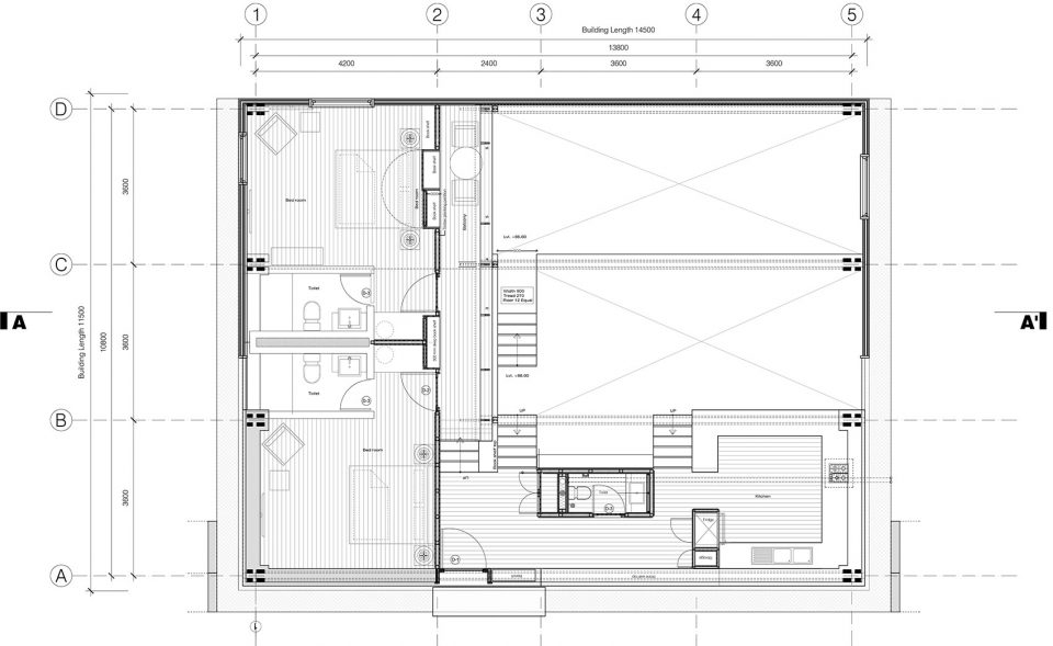 4個(gè)14.50 m跨度的sal木框架由多個(gè)膠合木板和薄鋼拉桿組成,支撐著整個(gè)用木材覆蓋的屋頂、隔熱的建筑外殼、整個(gè)木質(zhì)的夾層,并塑造了標(biāo)志性的雙層玻璃天窗。整個(gè)房子被懸掛在這些堅(jiān)固的桁架框架中,沒(méi)有任何中間柱的支撐,使得一種不受干擾的地形輪廓流進(jìn)入靜謐的松木鑲板的室內(nèi)空間。精心雕琢的方形窗戶,朝向各個(gè)方向,讓使用者得以禪觀各個(gè)山峰和不斷變化的云。