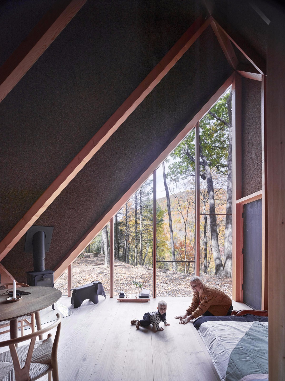 著名建筑事務(wù)所BIG在哈德遜河谷設(shè)計了一座帶有折角屋頂輪廓線的黑色小木屋。該建筑是預(yù)置住宅創(chuàng)業(yè)公司克萊因集團的第一個設(shè)計模型。該原型住宅起名為A45,是克萊因集團為業(yè)主提供的由著名建筑事務(wù)所設(shè)計的一系列微型住宅中的第一個。