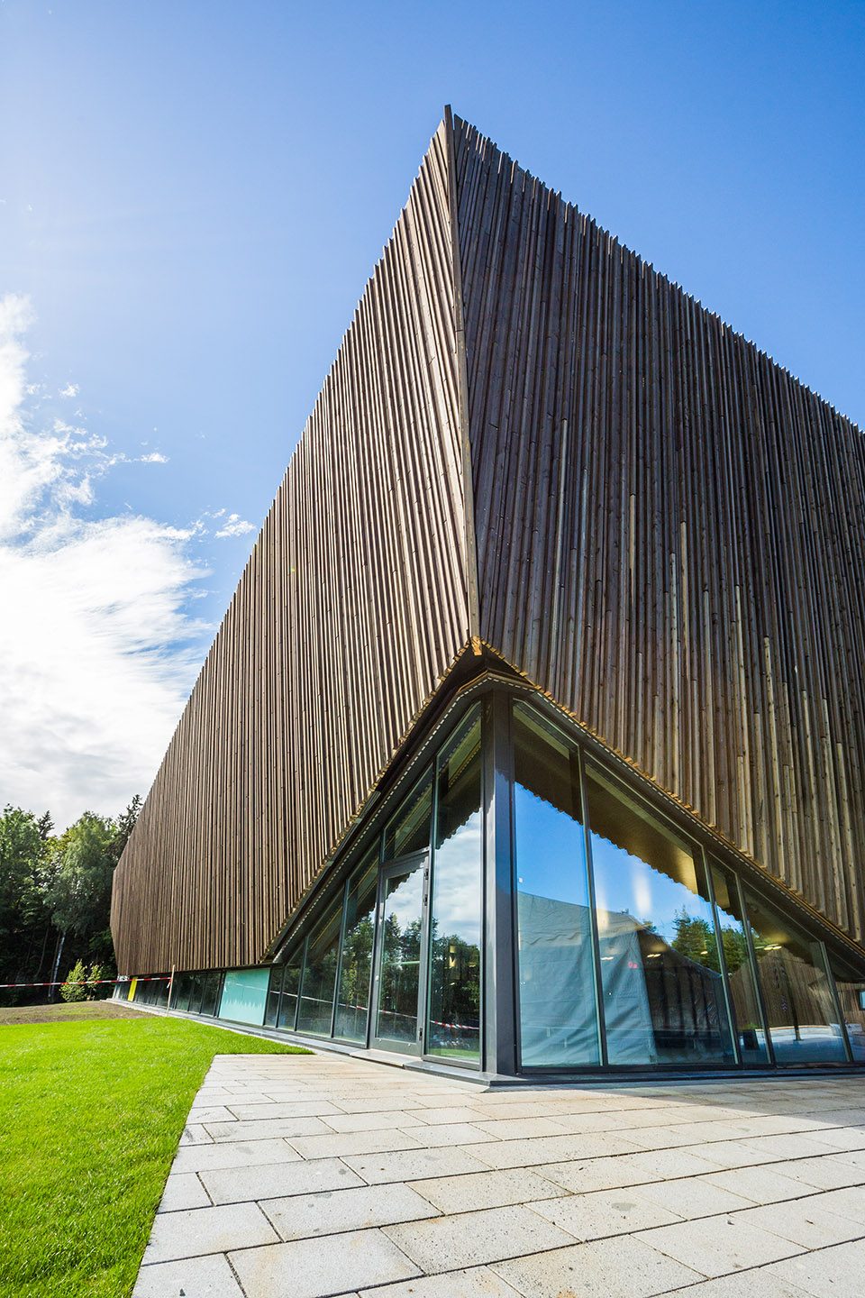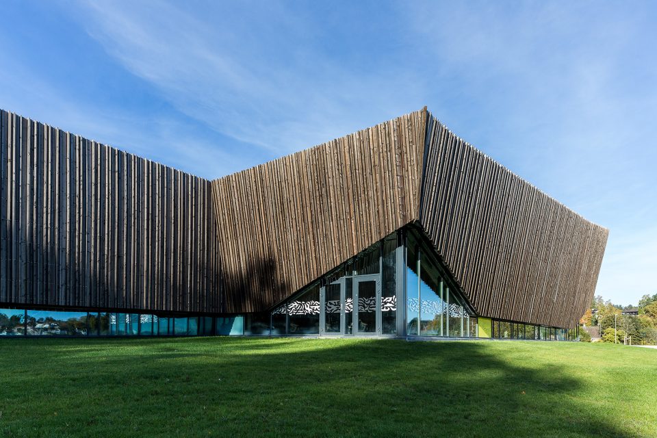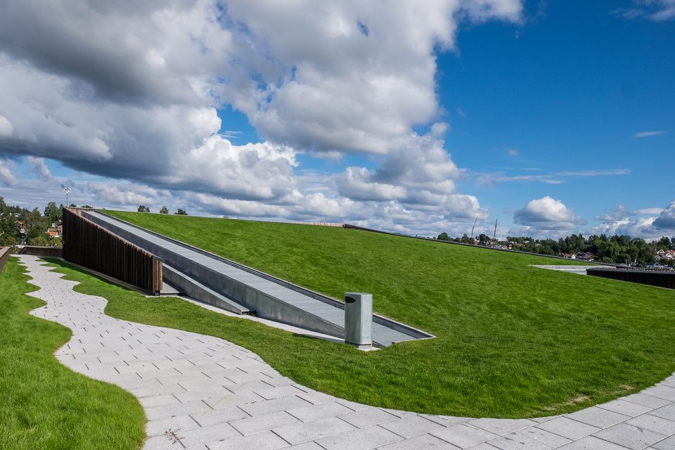 Holmen水上運(yùn)動(dòng)中心位于Holmen海灘,這里經(jīng)過(guò)填海造陸,保護(hù)和鞏固了場(chǎng)地的自然屬性。整個(gè)場(chǎng)地被花園覆蓋,為海灘帶來(lái)非凡的美景。該項(xiàng)目旨在活化建筑的屋頂,使之成為海灘休閑區(qū)域的一部分。鋪滿植被的屋頂向南面傾斜,在Oslo fjord的群島和礁石之上形成連續(xù)不斷的景觀。主入口、接待處、更衣室和游泳池皆位于建筑的主樓層,凌駕于向建筑方向傾斜的草坪之上。低處的樓層則容納了體育館、多功能廳、設(shè)備間以及辦公設(shè)施等。