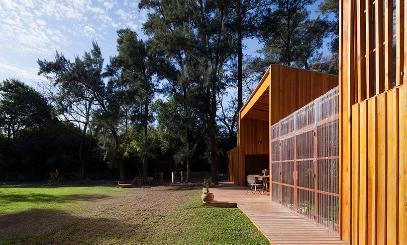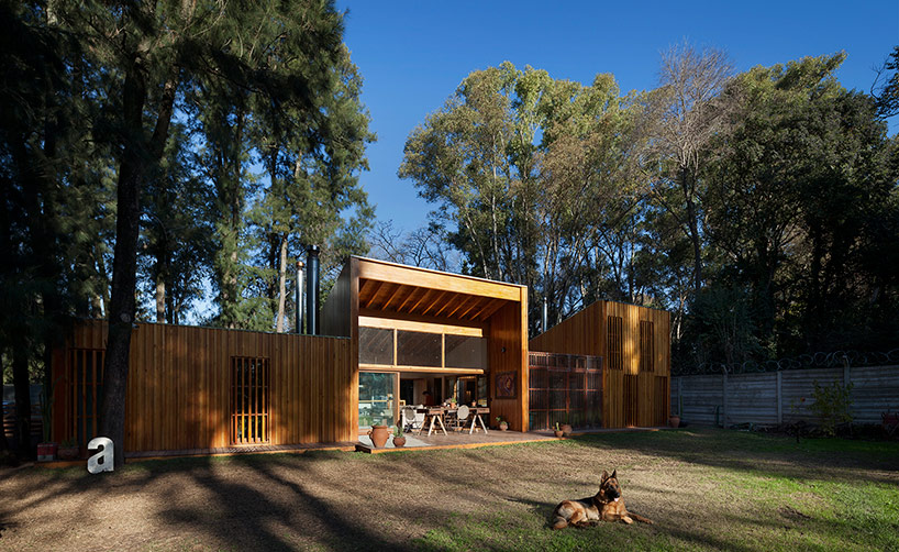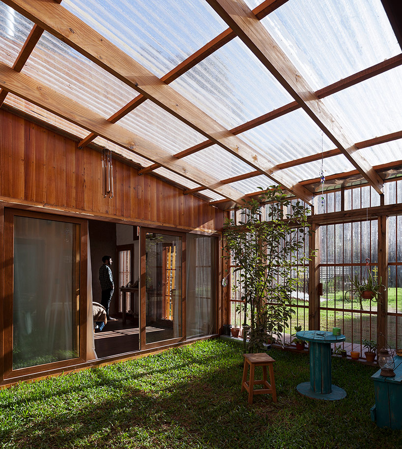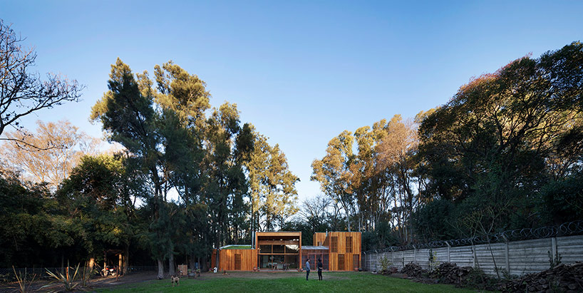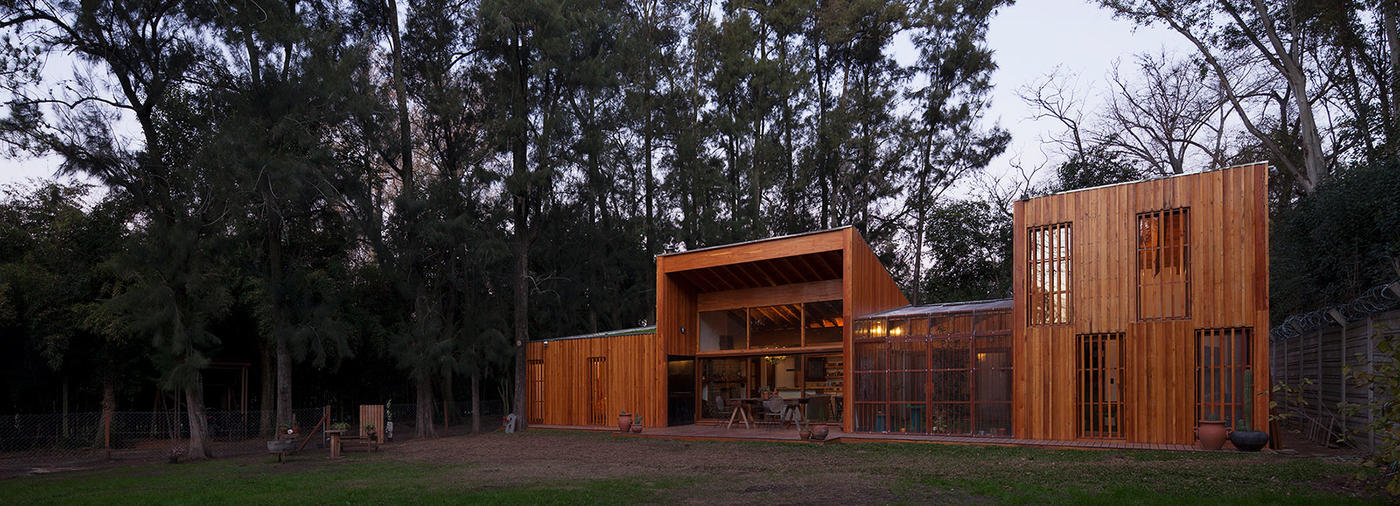 阿根廷建筑事務所IR arquitectura與我們分享的項目,是位于阿根廷布宜諾斯艾利斯(Buenos Aires)郊外托爾圖吉塔斯市(Tortuguitas)的 Casa Aa節(jié)能住宅。在這個養(yǎng)育著孩子的家庭住宅,家里明確地劃分出大人與小孩間的分隔,同時又融入樹木茂盛的場地環(huán)境中,擁有進行室外活動的空間和充沛的陽光。波浪狀聚碳酸酯屋頂覆蓋下的半室外綠色庭院是個溫室和有頂花園空間,并與位于中心位置的矩形起居空間相鄰。共享的起居區(qū)和主臥擁有朝北最高的洞口,使能照射到的陽光最大化,而建筑的外部形態(tài)因此被分割成四部分。上下交替的傾斜綠色屋頂提供了一個很好的天然熱絕緣體,還有助于替換建筑所占據(jù)的自然地被。