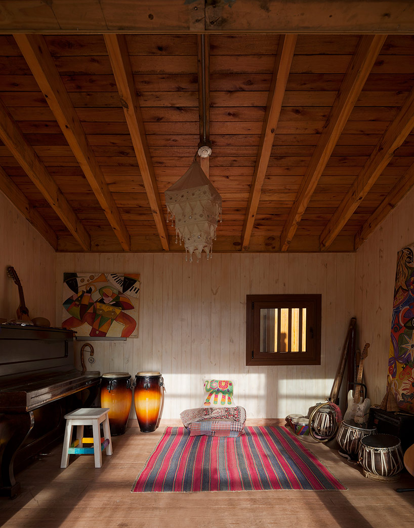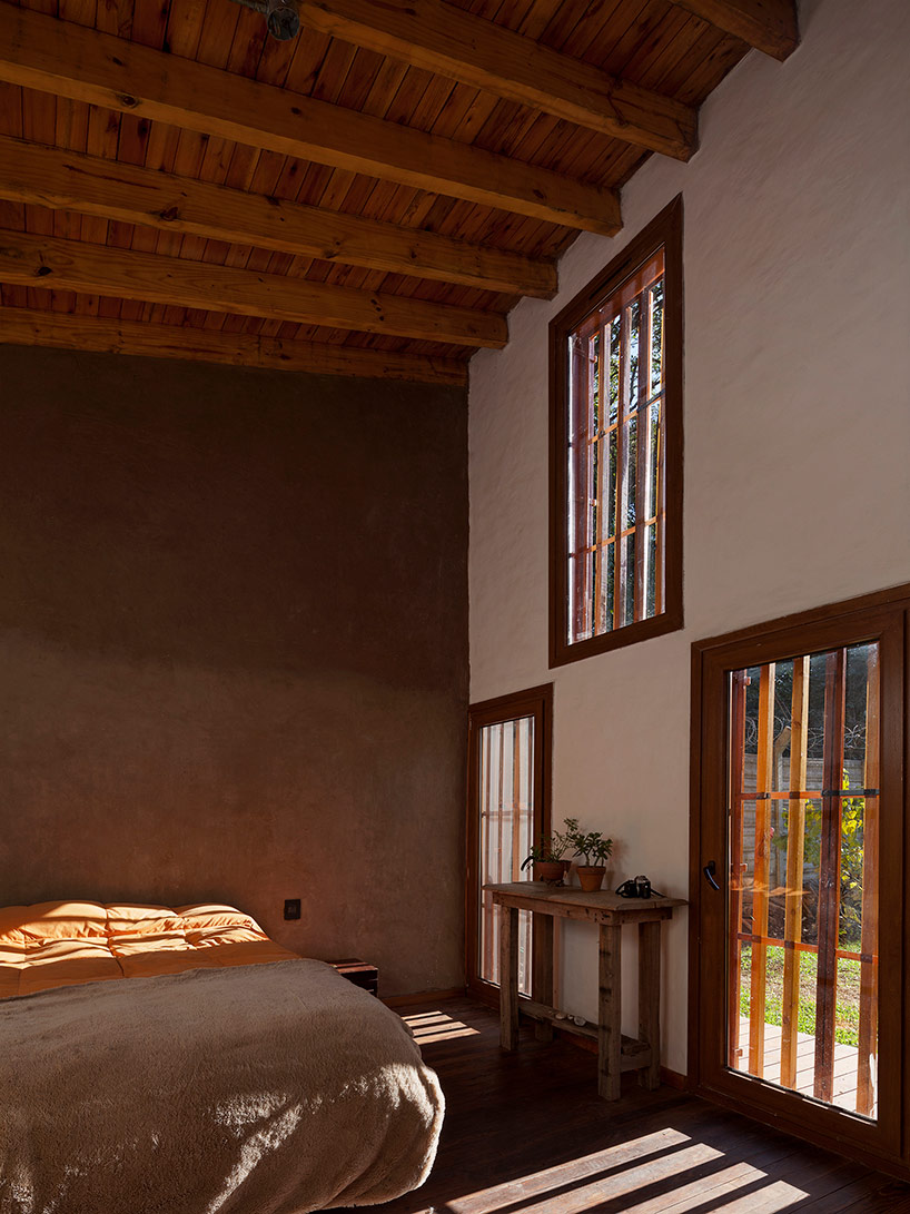該建筑的木框架結構,基本是由從本地采購的木材構成,而承重墻在下方支撐著厚層壓木梁。外部隔板的壁柱間的凹陷空間,被填充成濕茅草泥土墻,與綠色屋頂共同作用為低能耗、高熱效的建筑表皮。除了起居室擁有開闊視野和充沛光線的大面積玻璃窗之外,垂直排列的木板構成的其余外立面共同形成了微妙的韻律感。百葉木條不斷延伸排列橫跨窗戶,既保證了私密性,也是自然光的過濾器。
