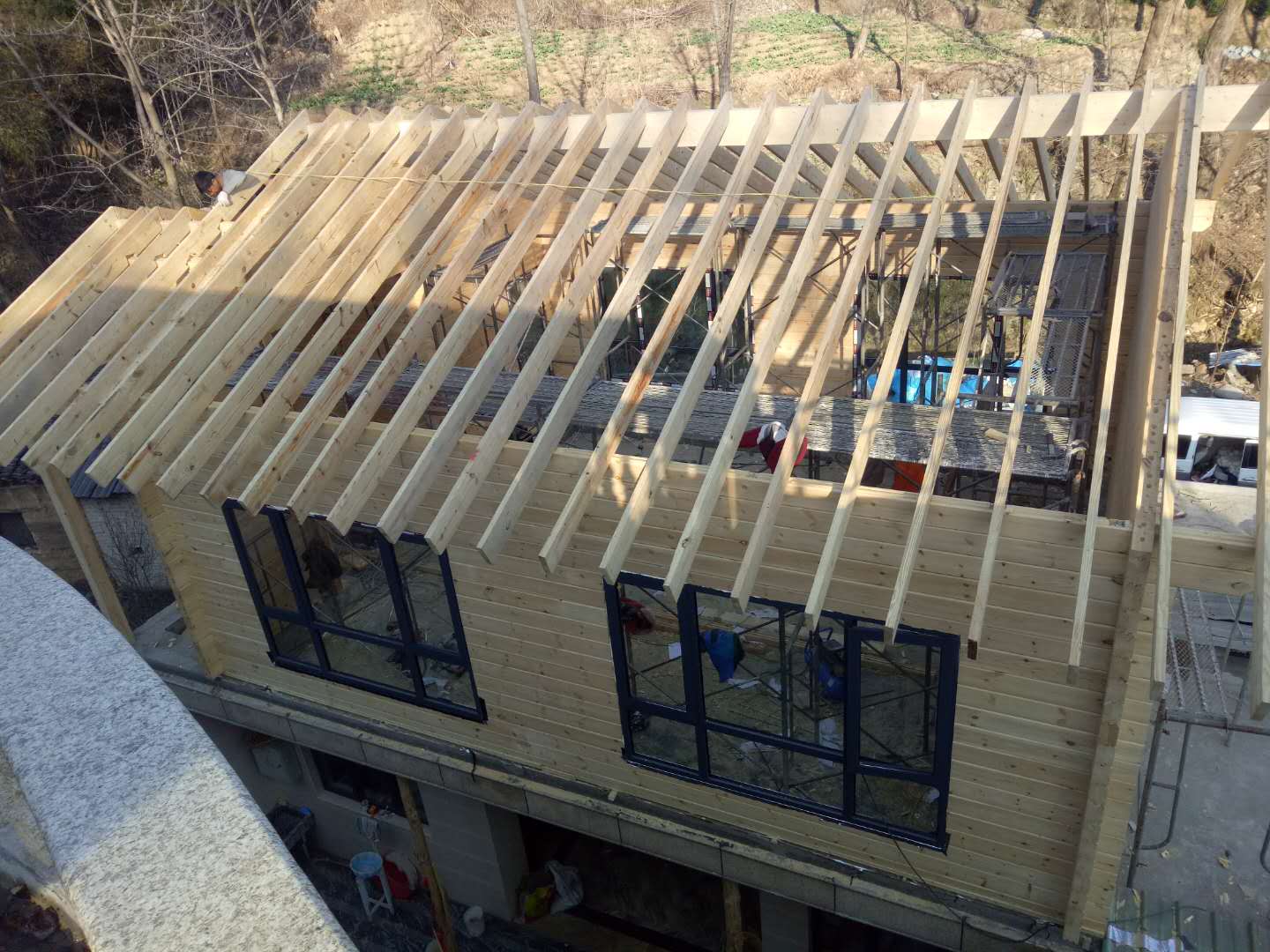 這個結(jié)構在日本應用較多,比起輕型結(jié)構完全靠五金連接一般鋸材,多了一些梁柱,整體結(jié)構性及耐用性都提高非常明顯。是相對效益最好,性價比最好的國標木屋結(jié)構之一。