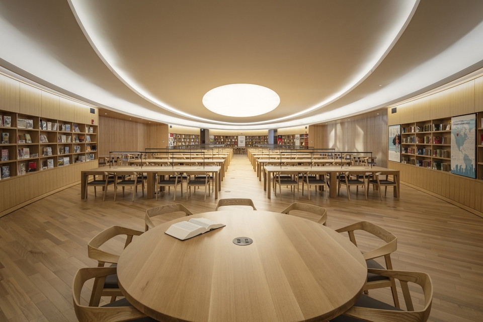 沿著拱門繼續(xù)走就走到了大廳和中庭,木質樓梯蜿蜒而上,最高處距離地面有85英尺,通過巨大的“天眼”可以看到天空的景象。木質格柵沿著開放式中庭的邊緣排列,從平面上看像是一個尖尖的橢圓,這樣布置可以讓人們能很快就明白圖書館的組織流線。圖書館內部使用的混凝土是外露的,且不加任何修飾,隱喻著室內空間的自由性。梁和柱的排列方式讓人聯(lián)想到古希臘建筑中用來聚會和知識交流的拱廊。保留材料的原始性,就是為了讓人們感覺到這個圖書館是一個大家能夠參與進來的地方,而不是一個神圣的藏書閣。
