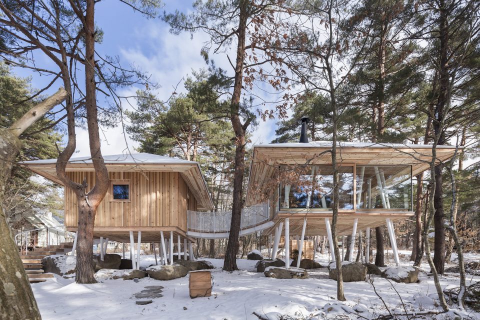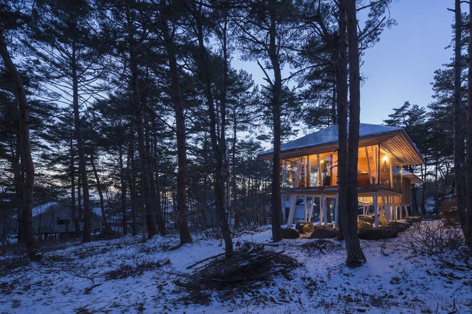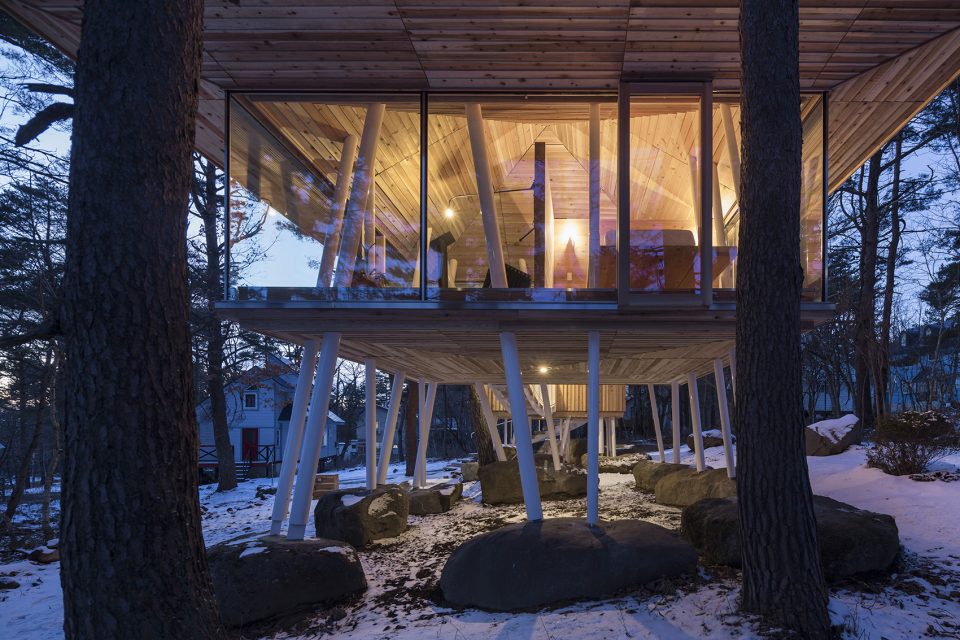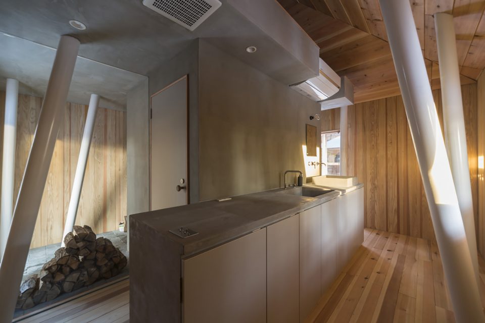 該地區(qū)常遇大雪天氣,因此建筑師利用架高的結(jié)構(gòu)為建筑賦予了2米多的雪荷載,以保證房屋不受大雪的破壞。住宅擁有兩個(gè)體量,分別容納了起居功能和生活用水功能。這兩個(gè)體量通過一座橋形成連接,使居住者能夠在橋上充分享受自然環(huán)境帶來的感官刺激。