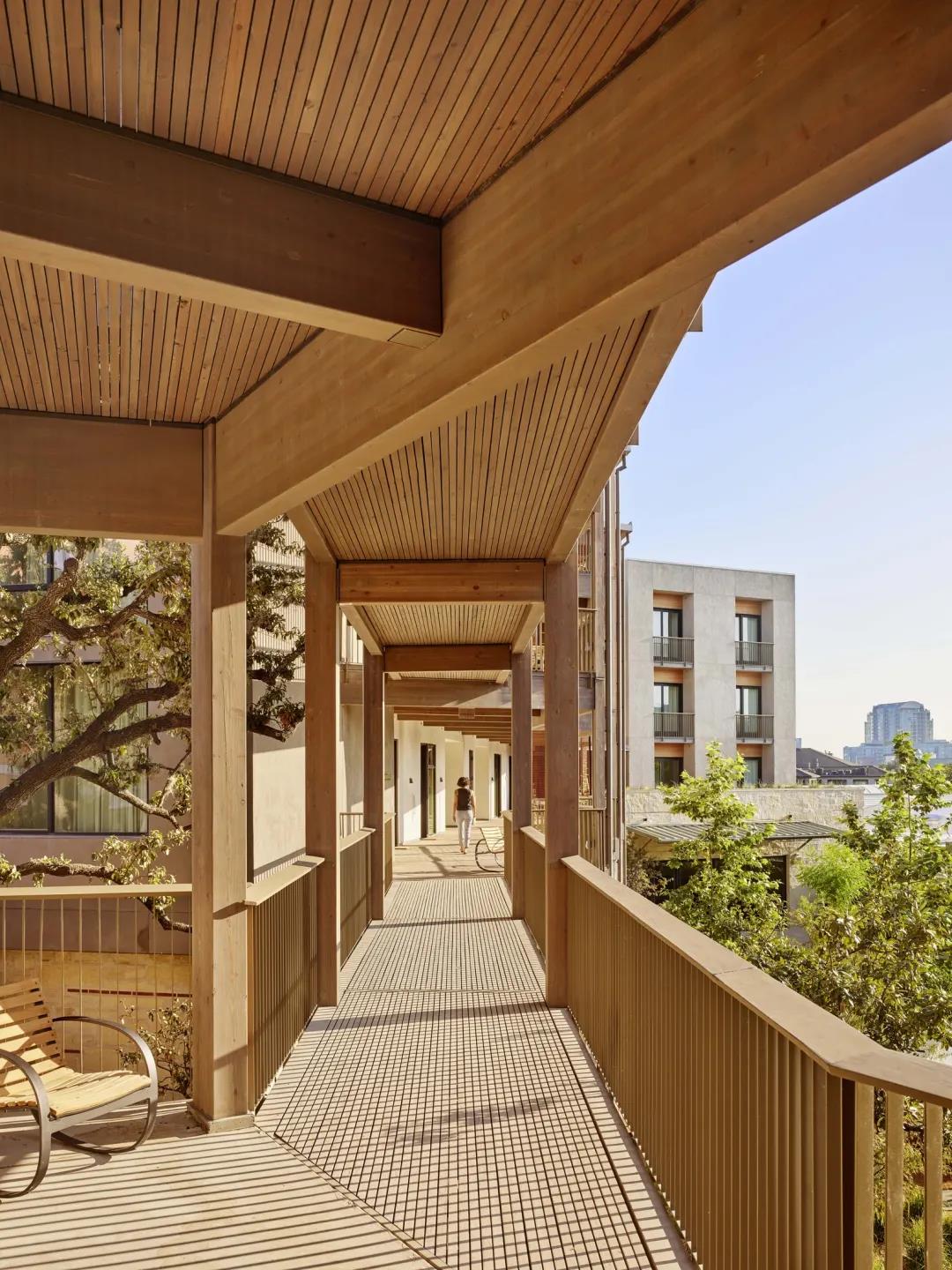 除此之外,還有其他幾處使用了定制的木結(jié)構(gòu)建筑構(gòu)件,其中包括 DLT 電梯和樓梯井、懸掛式陽臺、樓梯以及入口處的獨(dú)立門廊。