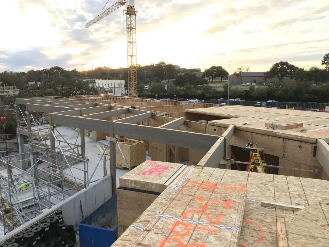 聲學(xué)設(shè)計(jì)也是早期設(shè)計(jì)階段的一個(gè)關(guān)鍵考慮因素。為了滿足 STC/IIC 等級,在 DLT 面板上放置了隔音墊以及鋪設(shè)了3 英寸的混凝土層。為了打造良好的居住環(huán)境,設(shè)計(jì)團(tuán)隊(duì)為了減少側(cè)翼噪音,在立柱墻內(nèi)安裝了隔音條。