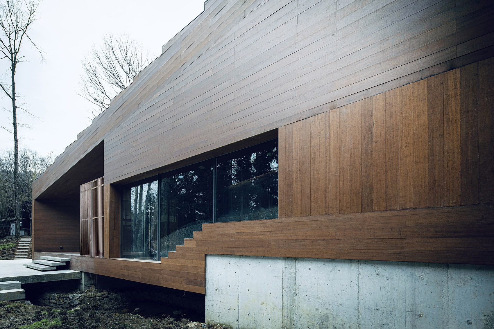 空間的大小是以人的基本尺度來(lái)定義的,建筑的墻面和屋頂都觸手可及,這種微小的尺度讓人時(shí)刻感受到建筑處于自然之中。這種接近于野營(yíng)帳篷的空間體驗(yàn),希望讓人時(shí)刻感受到自然就近在咫尺,只是隔了一層外墻的厚度。通體的木質(zhì)材料提供了溫暖而舒適的建筑內(nèi)襯,給人提供了舒適而愜意的生活氛圍,這和外部自然的野趣形成的強(qiáng)烈的反差,這種反差讓人對(duì)自然保持敏感,更能感受到自然之美,或溫柔細(xì)膩,或爆裂冷峻。