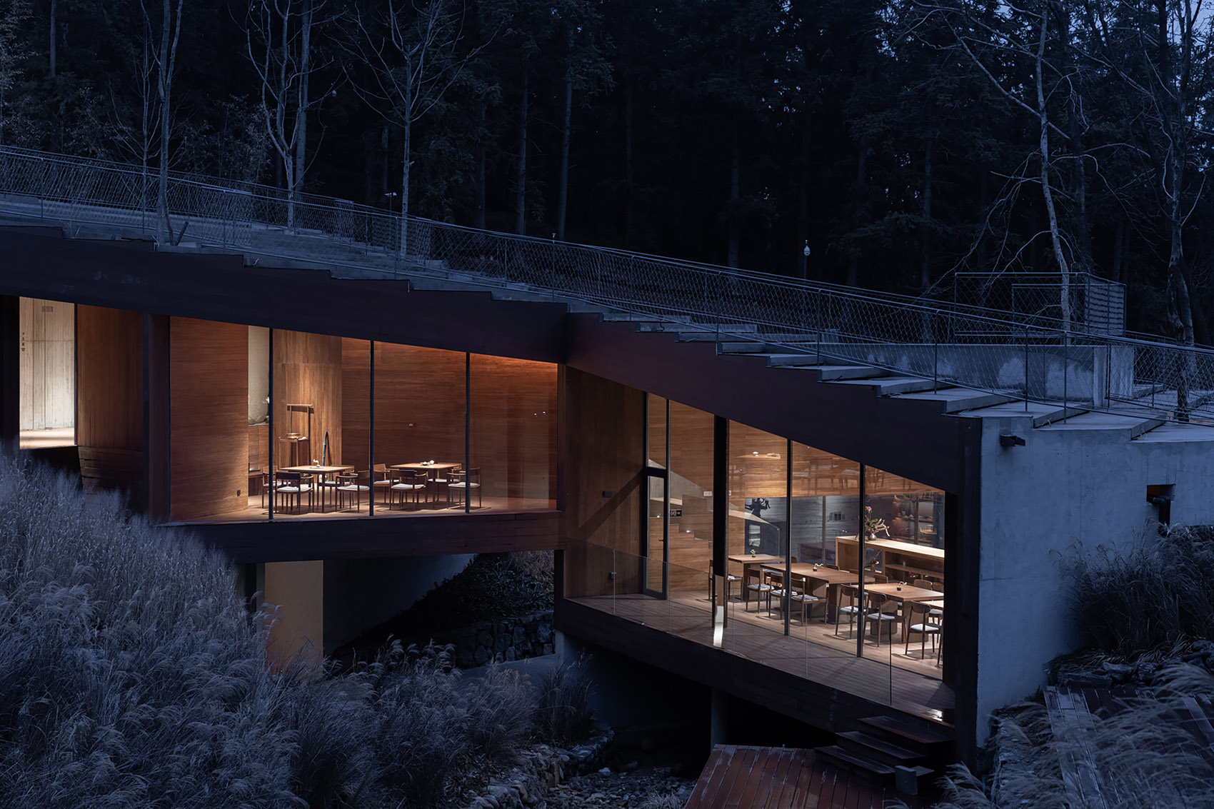 建筑的另外兩側(cè)分別嵌入山體之中,架空的蝶狀建筑的下方仍然保留了溪水和山路的通道。為了將部分樹(shù)木保留在室內(nèi),豎向結(jié)構(gòu)被設(shè)計(jì)成“柱院”,結(jié)構(gòu)意義上是柱子,空間意義上,是保留了一棵樹(shù)的“微院”。屋面是一個(gè)臺(tái)階狀的坡屋頂,可作為小型演出的森林劇場(chǎng),室內(nèi)空間被這個(gè)大坡屋頂統(tǒng)一起來(lái),并因?yàn)椴煌孛鏄?biāo)高的變化而富有節(jié)奏。